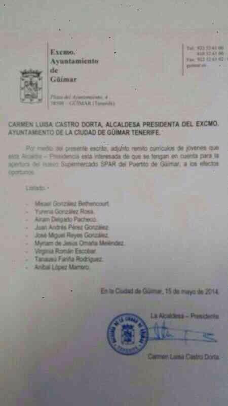 Según informa ElPlural.com, el documento ha salido de la Alcaldía de Güímar (Tenerife), que preside la pepera Carmen Luisa Castro. Tiene el membrete y el sello del Ayuntamiento y la firma de la alcaldesa, pero cuesta dar crédito a la carta. El texto en cuestión dice: “Por medio del presente escrito adjunto curriculum de jóvenes que esta alcaldía está interesada que se tengan en cuenta para apertura de supermercado SPAR del puerto de Güímar a los efectos oportunos”